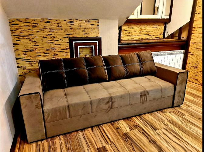 Меблі: шафи вбудовані, двері-купе, полиці, стелажі, кухонний гарнітур. Диван двоспальний, крісло-ліжко односпальне, 4 стільці, стіл кухонний зі стільцями, Стіл офісний, Диван для вітальні, тумбочки,