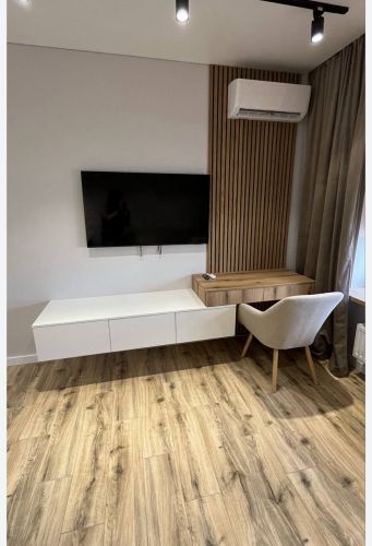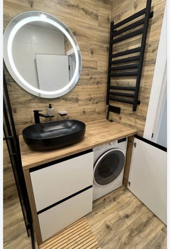 • ванної кімнати, обладнаної душовою системою, туалетом, пральною машинкою, сушаркою для рушників, бойлером, дзеркалом з підсвіткою, двома тумбочками для дрібниць і шафою для побутової хімії;