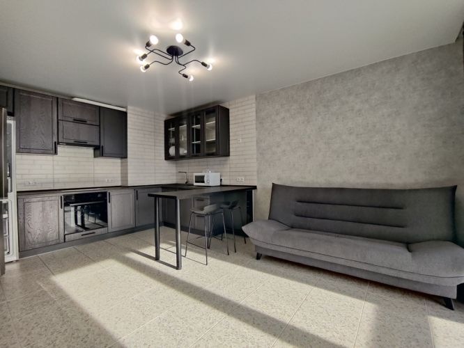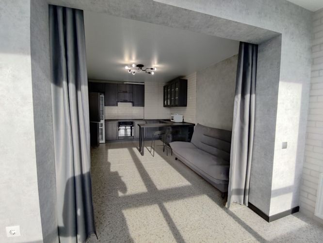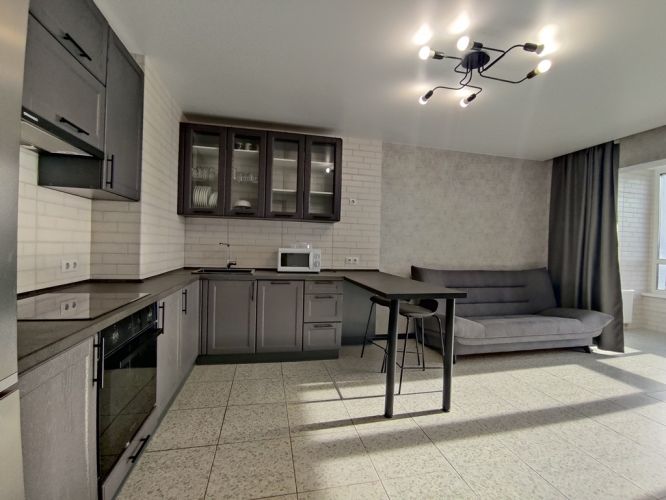 Вбудована кухня - вітальня з побутовою технікою, холодильник, керамічна поверхня, витяжка. М'який диван і зона відпочинку для приходу гостей. Кухня в великим панорамним вікном.