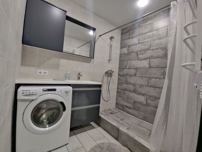Передпокій із шафою. Роздільний санвузол, бойлер. Ванна зі душ-кабіною та пральна машина. Лічильники на тепло.