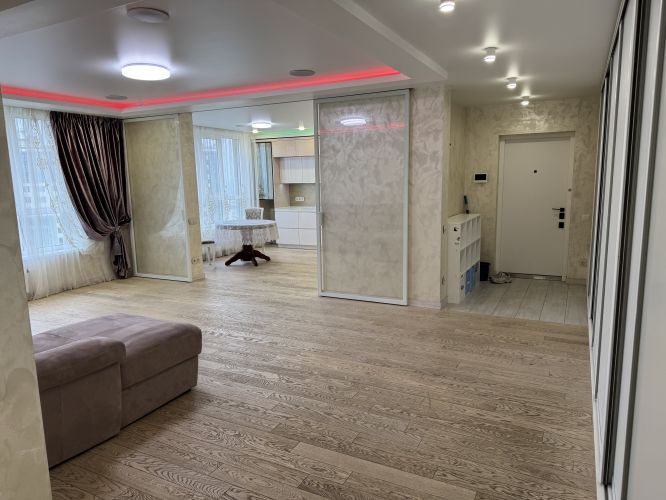 О квартире: 100/56/18м2, евроремонт, комнаты смежно-раздельные, с/у раздельный, на полу паркет, интернет, СМА, холодильник, мебель