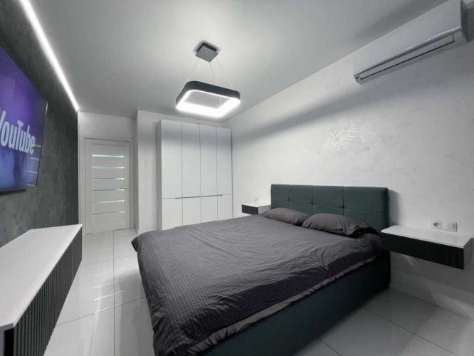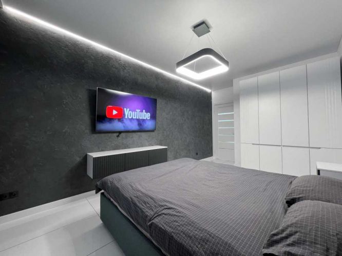 Спальня велике двоспальне ліжко з ортопедичним матрацом, містка шафа, кондиціонер CooperHunter, телевізор Samsung 58" Smart TV. Ролети на вікнах, тюль і blackout-штори забезпечують спокійний сон.
