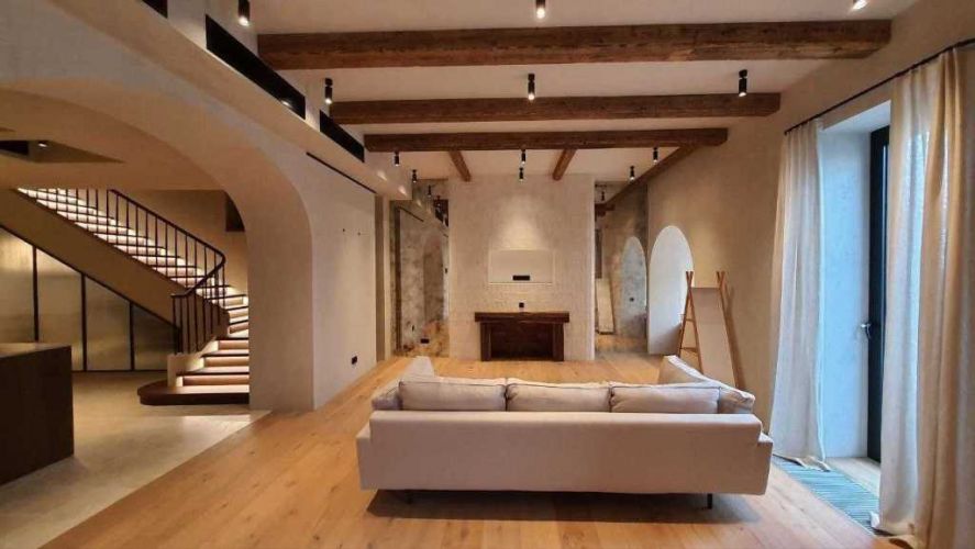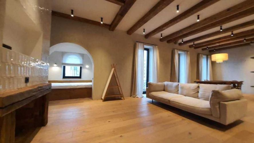 Квартира бездоганно оброблена натуральною штукатуркою, доповнена паркетом і мармуровою підлогою, а також автентичні дерев’яні елементи.