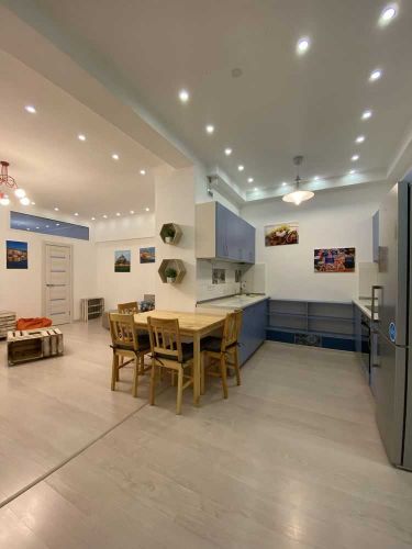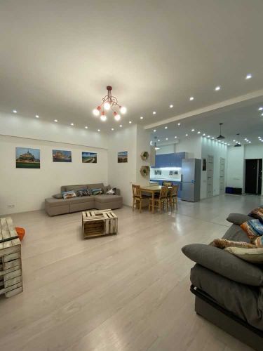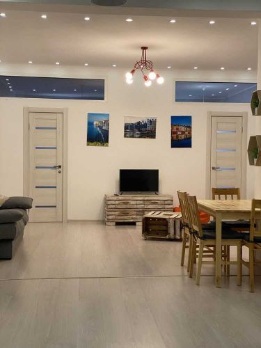 Затишна, світла квартира з повним меблюванням та побутовою технікою. Спальня з двоспальним ліжком, комодом . Дитяча кімната з ліжком, велика кухня студія з диванами, столом і телевізором , один санвузол, гардеробна.