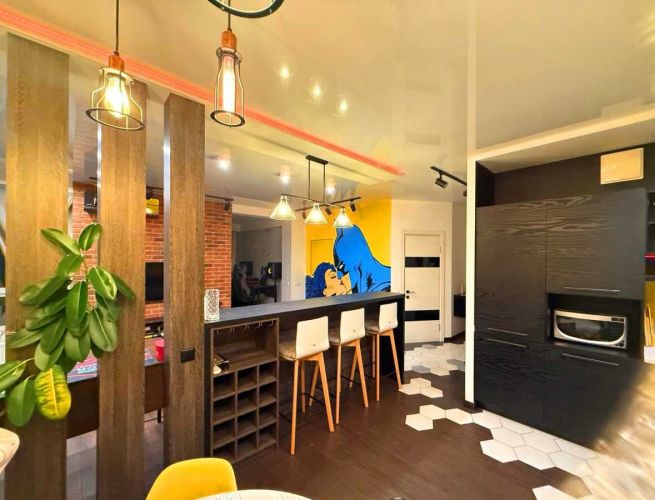 У квартирі є не тільки простора кухня - бар - студія площею 32м2, оснащена всією побутовою технікою і максимально зручна для відпочинку і прийому гостей, але і окрема тиха СПАЛЬНЯ, де ви можете повноцінно розслабитися і відновитися для наступного дня. Повне оснащення побутовою технікою і посудом для повноцінного комфортного життя: посудомийна машина, СВЧ-піч, гриль, тостер, кавоварка De Longhi, пральна машина-автомат, холодильник, електрочайник, пилосос, зволожувач повітря, кондиціонер, бойлер. Лічильники води, електрики та тепла та багато іншого.