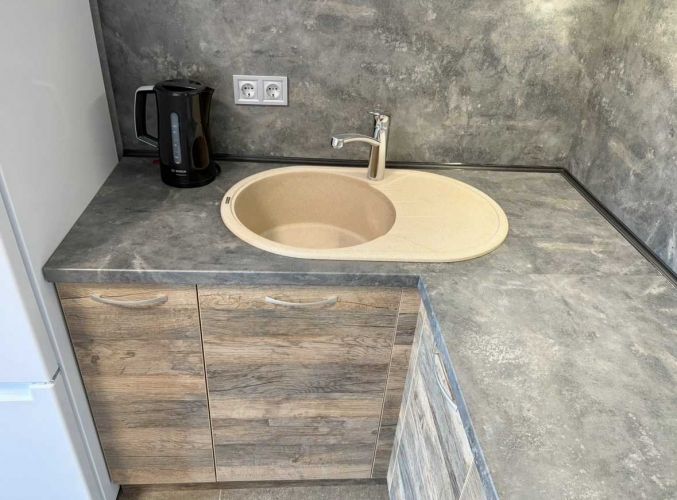 -Вбудована кухня, варильна поверхня, мікрохвильова піч, холодильник, витяжка.