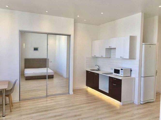 Сдам 1-комнатную студию на 2-й ст.Люстдорфской дороги/ ЖК" Одиссей", 17/18, 33м общая, современный ремонт, 2-х спальная кровать, шкаф-купе, душ, бойлер, кондиционер, интернет. Автономия, охрана, видеонаблюдение. Без детей. За животное доплата.