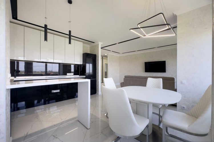 простора кухня-вітальня, окремо спальня, два санвузли, в одному із яких розташована пральна машина.