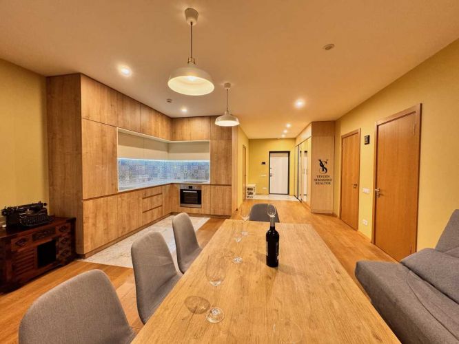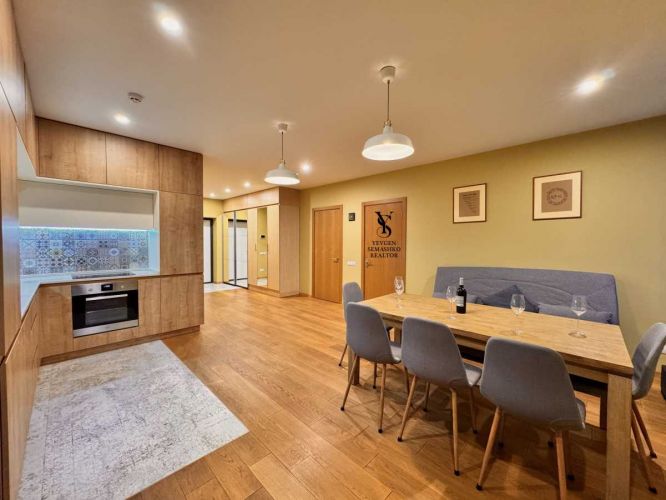 Обладнана необхідними якісними меблями та технікою для комфортного проживання: двоспальне ліжко з ортопедичним матрацом, зручний диван, робочий стіл з кріслом, варильна поверхня, духова шафа, витяжка, вбудований холодильник, плазмовий телевізор, три інверторних кондиціонера, душова кабіна, пральна та сушильна машина, бойлер, пилосмок.