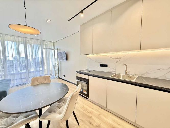- Квартира знаходиться на 18 поверсі/25 поверхового будинку загальною площею 47 кв.м, кухня-студія 19 кв.м + окрема кімната площею 15 кв.м, лоджія, та с/в.