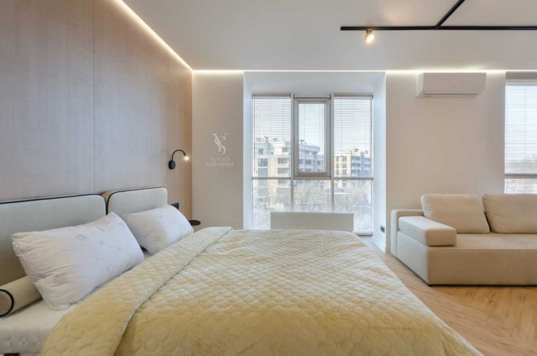 Обладнана необхідними якісними меблями та технікою для комфортного проживання: двоспальне ліжко з ортопедичним матрацом, зручний диван, столешня на кухні з натурального каменю, варильна поверхня, духова шафа, мікрохвильова піч, витяжка, вбудований холодильник, посудомийна машина 45 см, плазмовий телевізор з діагоналлю 55 дюймів, інверторний кондиціонер, душова кабіна, пральна машина автомат, бойлер на 50 літрів, пилосмок, праска. Тепла підлога у санвузлі.