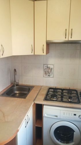 Кухня обладнана кухонним гарнітуром та вбудованою газовою поверхньою. Є пральна машина-автомат, холодильник та бойлер. У кімнаті — розкладний диван та стінка для зберігання речей. У ванній кімнаті та на кухні — плитка. Санвузол суміщений.