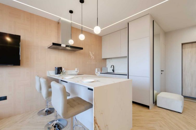 Обладнана необхідними якісними меблями та технікою для комфортного проживання: двоспальне ліжко з ортопедичним матрацом, зручний диван, столешня на кухні з натурального каменю, варильна поверхня, духова шафа, мікрохвильова піч, витяжка, вбудований холодильник, посудомийна машина 45 см, плазмовий телевізор з діагоналлю 55 дюймів, інверторний кондиціонер, душова кабіна, пральна машина автомат, бойлер на 50 літрів, пилосмок, праска. Тепла підлога у санвузлі.