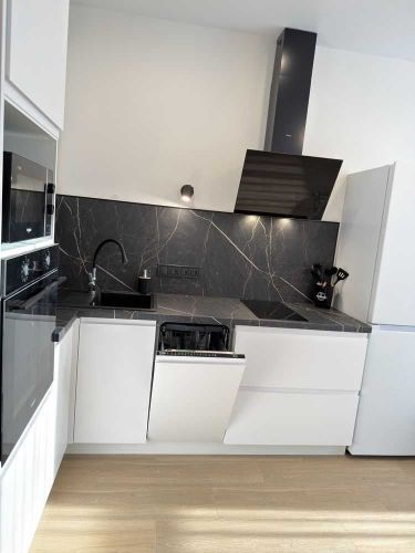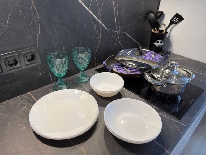Укомплектована меблями та побутовою технікою. Вбудовані кухонні меблі (з дорогими фарбованими фасадами), двоспальне ліжко, тумби приліжкові, двоспальний диван (для гостей), стіл, стільці, журнальний столик, прихожка для верхнього одягу, гардеробна кімнатка з купою місць для зберігання одягу (полиці, шухляди, штанги для тремпелів). Вбудована техніка (варильна поверхня, духова шафа, посудомийна машина), мікрохвильова піч, кондиціонер, двокамерний холодильник, кухонна витяжка, великий бойлер, пральна машина автомат, праска, прасувальна дошка, сушарка для одягу, вішалки (тремпелі), гарний новий посуд і т.д., згідно фото.