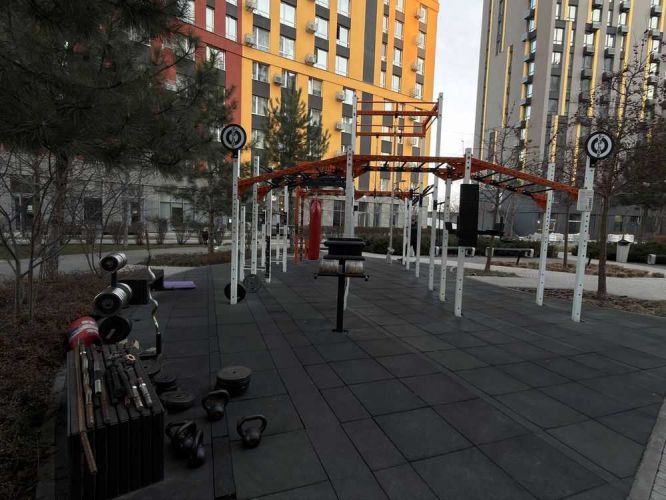 Внутрішній простір з ландшафтним дизайном та фонтанами, влітку цвітуть Гортензії, весною Сакури. Облаштовані крутезні спортивні та дитячі майданчики, продуктові магазини, магазин для тварин, кавярні.