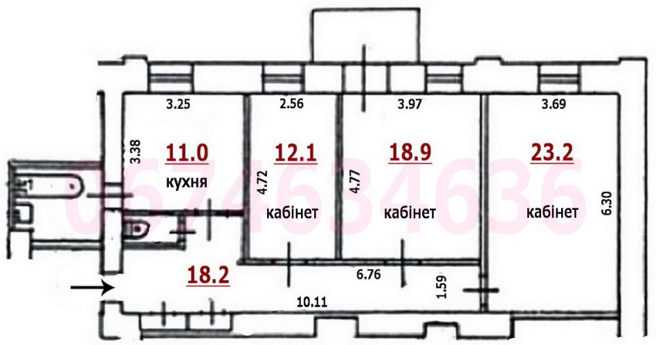 - холл-рецепция 18 м2, 3 отдельных кабинета (23 м2, 19 м2, 11 м2), оборудованная кухня 11 м2, 2 санузла (душевая кабина), балкон;