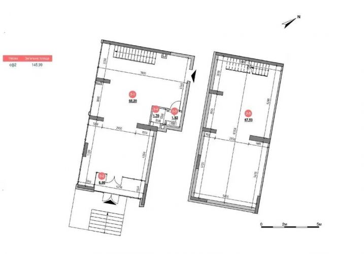 Загальна площа 146 кв.м – 1 поверх 78,46 кв.м та цоколь 67,53 кв.м.
