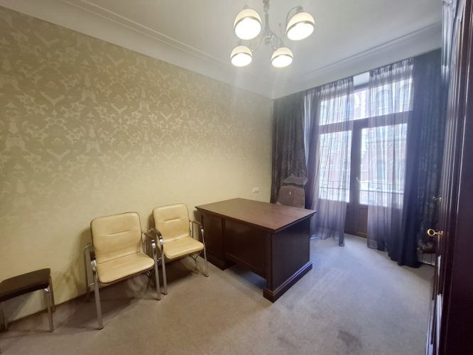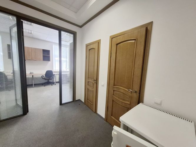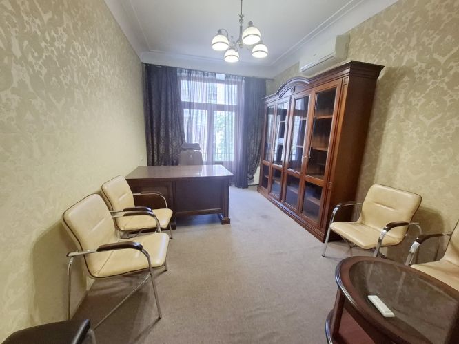 Інститутська, 14, офіс з видом на Національний банк України. 90 кв.м., сучаснний офісний ремонт. Приймальна, кабінет керівника з балконом, 3 окремі кабінети, міні-кухня, с/в. Офіс повністю мебльований, TV, Інтернет, комп'ютерне розведення, охоронна та пожежна сигналізація, кондиціювання, холодильник. Фасадне парадне з ремонтом на кодовому замку. Сусіди – офіси. Світло не вимикають.