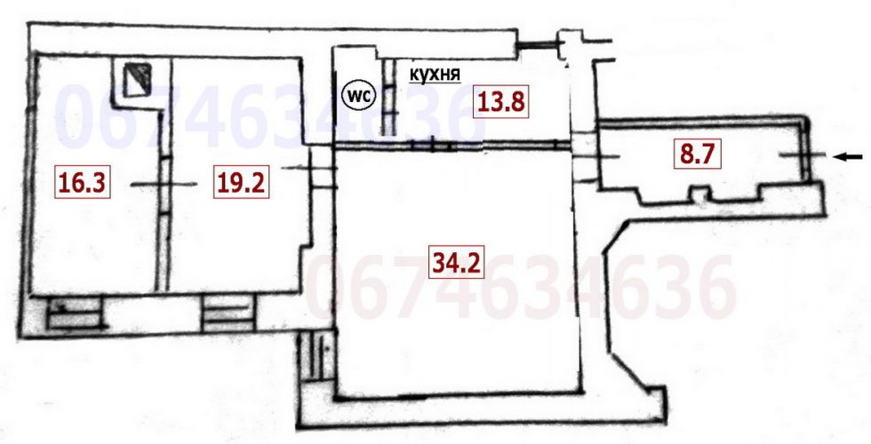 - холл 9 м2, зал-открытое пространство 34 м2, 2 смежных кабинета (19 м2, 16 м2), оборудованная кухня 14 м2, санузел (душевая кабина);