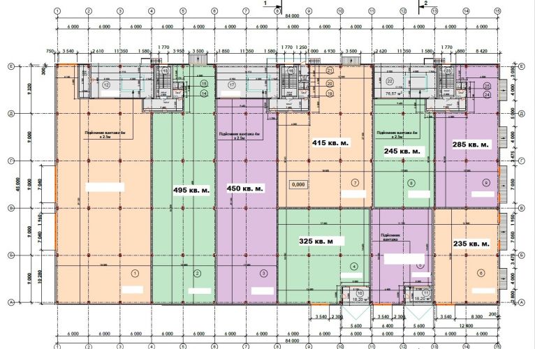 Висота стель виробничого корпусу 1-й поверх –6 метрів, Корисне навантаження на підлогу - 5т/м 2. Підлога - монолітна з знепилюючим зміцнюючим покриттям. Крок колон 6*9 м. Частину приміщень можна обладнати стелажами висотного зберігання за замовленою комплектацією.