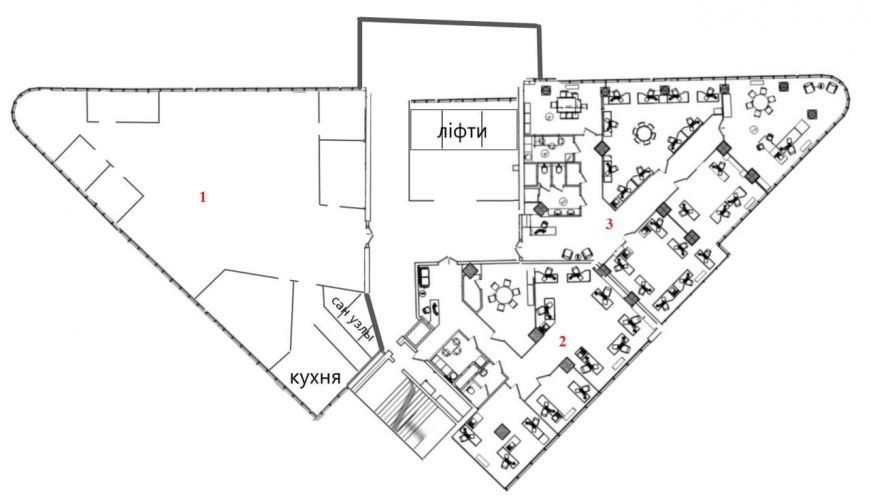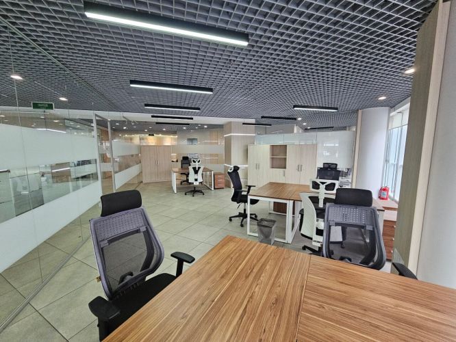 Простір розбитий на зручні блоки, які ідеально підходять для розміщення відділів, переговорних, лаунж-зон або робочих кабінетів. Гнучке планування дозволяє адаптувати офіс під будь-які бізнес-завдання від IT-компанії до юридичного холдингу.