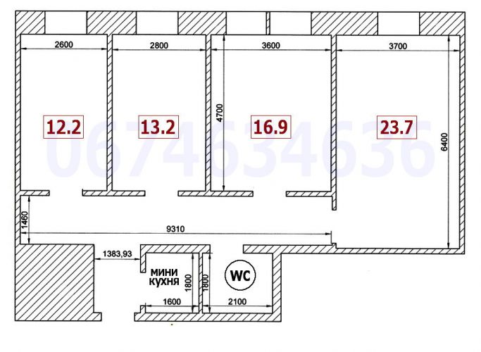 - холл-коридор, 4 отдельных кабинета, мини-кухня, санузел, балкон;