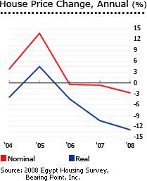 Некоторые местные рынки в Египте (например, некоторые области в Каире, Средиземноморское побережье, и области в пределах Красного моря) резко росли в цене с 2005 до начала 2008. Тогда как с середины 2008 и в течение большей части 2009, рынок недвижимости резко замер из-за глобального кризиса.