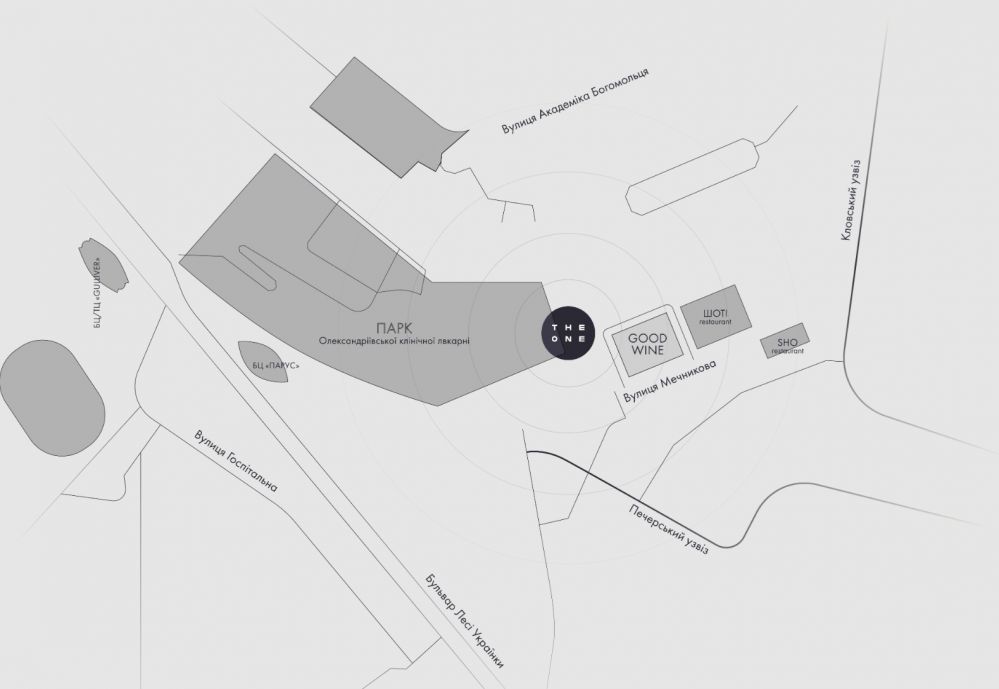 Жилой комплекс THE ONE расположен в Киеве, Печерский район, престижный микрорайон Клов, на ул. Мечникова, 7б. Комплекс находится в непосредственной близости от станции метро "Кловская" (1 минута пешком), что обеспечивает исключительную транспортную доступность.
