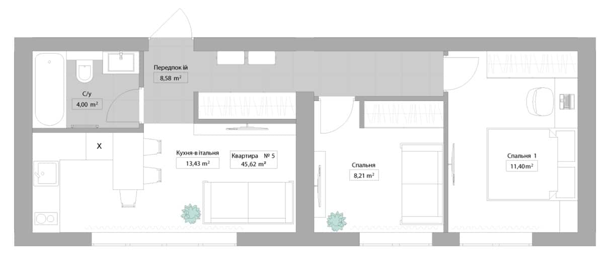 | 1-комнатные 22.8 м2 | 2-комнатные 45.62 м2 |