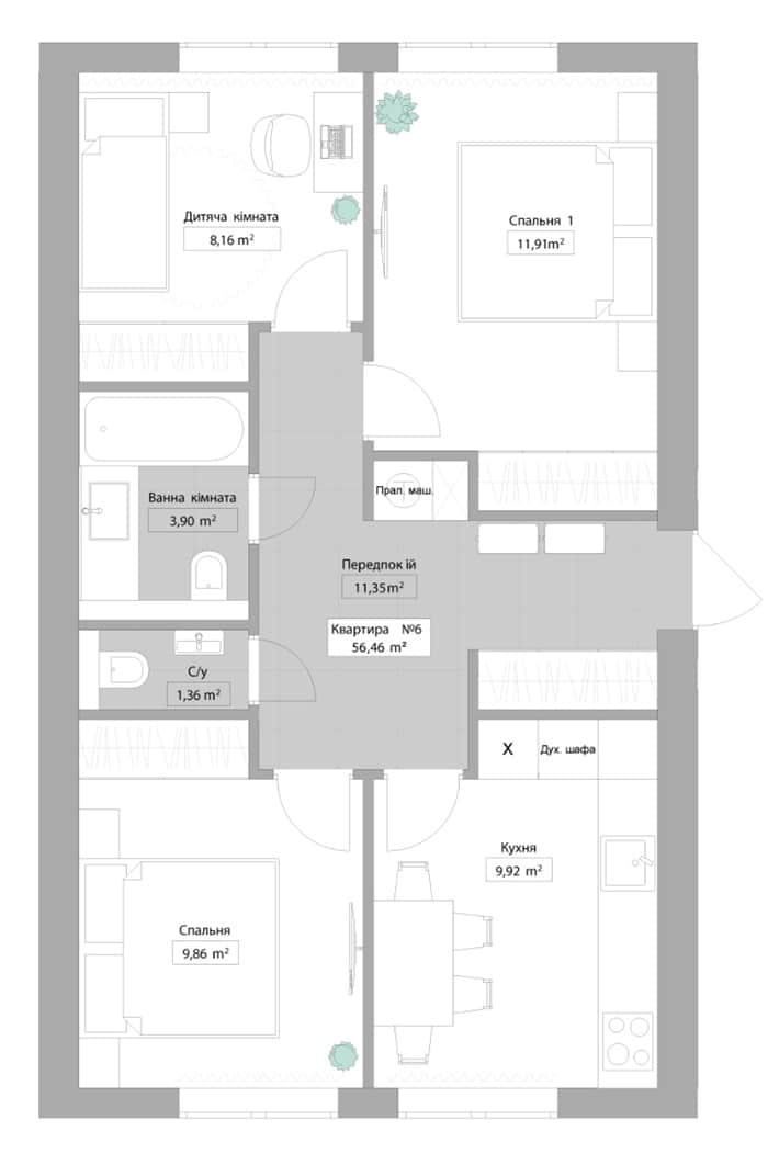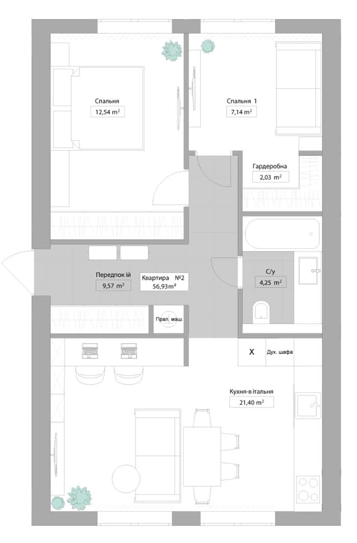 | 2-комнатные 56.93 м2 | 3-комнатные 56.46 м2 |