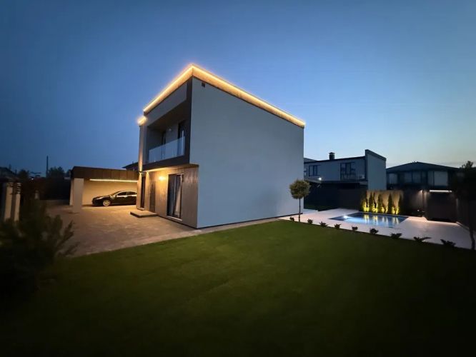170 м2, кол-во этажей - 2, материал - газоблок, новый дом, участок 6 соток, ландшафтный дизайн, рядом вода, парковка, бассейн, элитный дом, свет, водопровод, отопление, канализация;