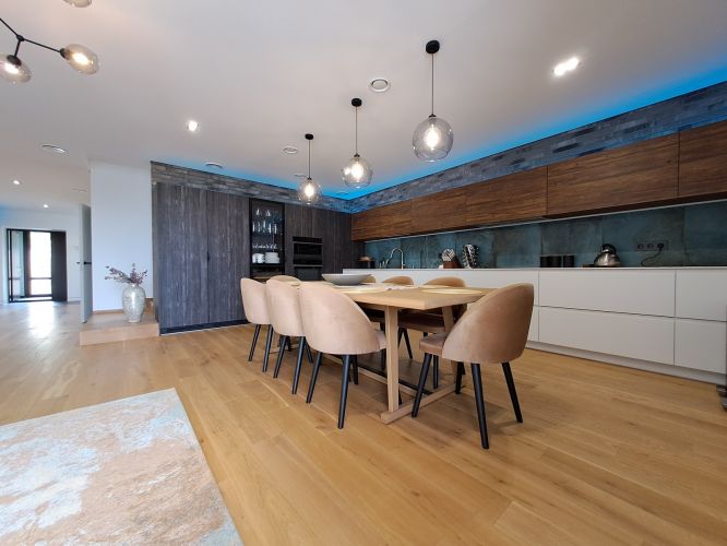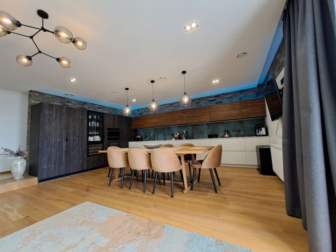 - Повністю облаштована кухня з фурнітурою Blum: вмонтований двохдверний холодильник та винний холодильник