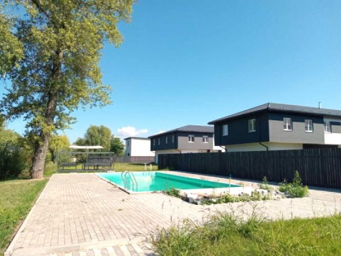 100 м2, кол-во этажей - 2, материал - газоблок, участок 1.5 соток, участок пустой, рядом вода, парковка, бассейн, свет, водопровод, отопление, канализация;