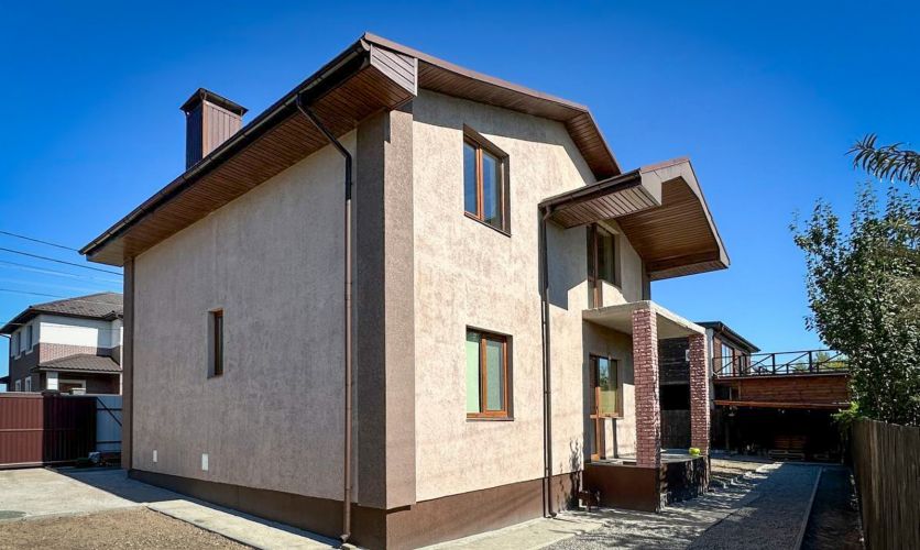 Висота стелі на першому поверсі - 3,00 м., на другому - 2,65 м. Залізобетонні перекриття між поверхами. Стіни, - піноблок 30 см., утеплений мінеральною ватою 100 мм, оздоблені «короїдом», пофарбовані в теплий елегантний колір. Дах - м’яка черепиця ззовні і посилене утеплення з паробар?єром всередині.