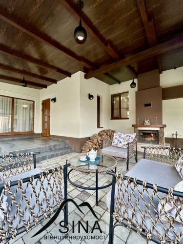 На 1-му поверсі кухня з великою вітальнею, 5 окремих кімнат, 3 санвузли, топкова, засклена тераса з каміном.