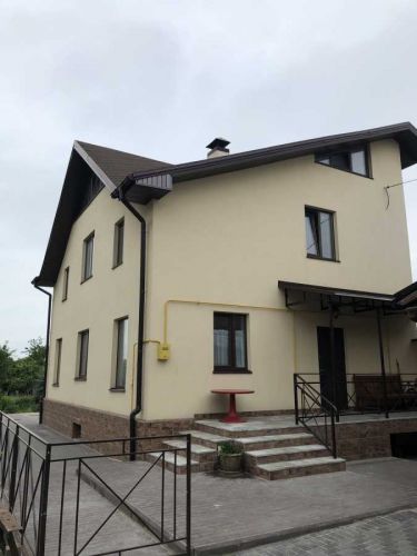 Продаж будинку в самому центрі Крюковщини по вул. Жовтнева. 219,4/70,7/21,8 кв. м. По факту 254 кв.м.Свіжий ремонт (закінчений рік тому), дорогі меблі, вся необхідна техніка. Усі комунікації. Електрика: лічильник 3 фази. Газ, газовий котел, гаряча вода як від котла, так і від електричного бойлера на 80 л, водопровід від колодязя, каналізація - септик. Перший поверх 71,8 кв.м, повністю закінчено ремонт, стіни - шпалери, підлога - плитка, підлога має теплий електричний підігрів. вітальня з каміном 26,8 кв. примикає до кухні-їдальні 21,8 кв.м. Вбиральня та передпокій - з вбудованими меблями та дзеркалами. Камін, що діє, в залі. 2 санвузли (4,5 та 5 кв.м). Ванна облицьована плиткою. Другий поверх 63,6 кв. м має чорнову штукатурку (2 спальні та ванна кімната), електрика та опалення виконані повністю, підлоги та двері не встановлені. Одна спальня з балконом з оздоблювальними роботами. 3 поверх: мансарда 35 кв. м не включена до тих паспортів як житлова, але відремонтована - вагонка, ламінат; 3 гостьові спальні; висота 2,2 м, спальні місця, світильники, вбудовані шафи. Підвал: 65,7 кв. м; підлога бетонна, без оздоблювальних робіт, але 8,00 кв. м частина коридору підвалу з оздобленням: пофарбовані стіни, плитка на підлозі, у всіх кімнатах підвалу встановлені двері. Багато підсобних приміщень різного призначення. 3 облаштовані вбиральні кімнати. Є льох. Ділянка 7 сотки. У саду плодові фруктові дерева, ромашкова галявина, багато декоративних рослин.