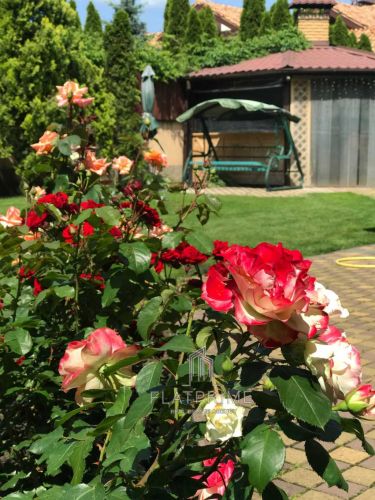 На подвірї передбачена генераторна, відкатні ворота з електроприводом, навіс для 2-х авто, простора альтанка із зоною барбекю, обладнано систему автополиву. Двір прикрашають квіткові клумби та хвойні дерева.