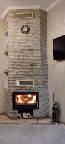 -камін на дровах із тепловою сорочкою на радіатори;