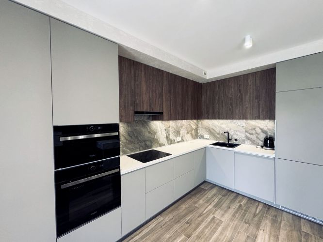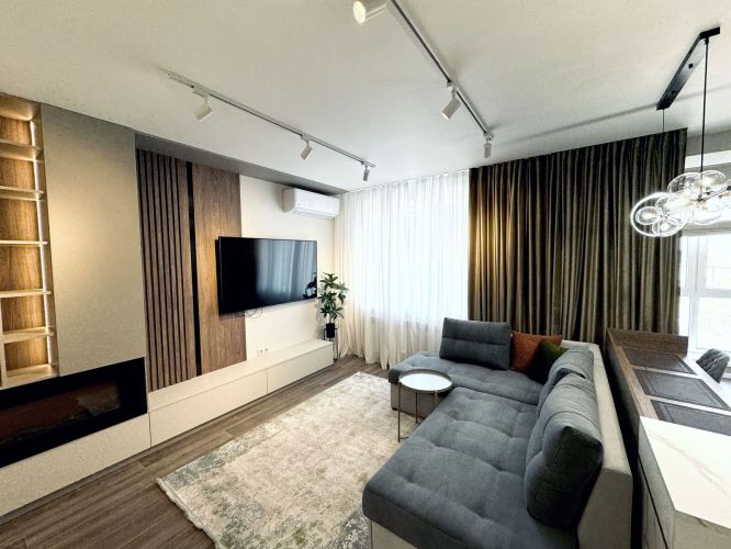 Площадь 70м2, двухсторонняя планировка: просторная кухня - гостиная с балконом, отдельная спальня, санузел, гардеробная.