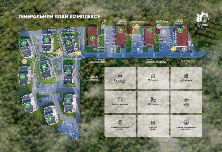 Комплекс має власну інфраструктуру: продуктовий магазин, аптека, дитячий садок і дитячий майданчик, зупинка транспорту, поштомат, парковки. Все необхідне є біля будинку.