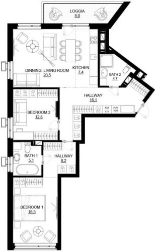 О квартире: 92/29/28.7м2, без отделки, комнаты раздельные, 2 с/у, лоджия, двусторонняя, свободная планировка