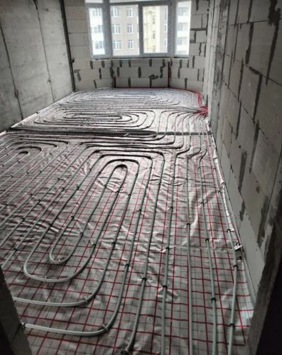 Тепла підлога під: кухнею-студією (розділена на дві зони), коридором, санвузлами, балконом, а в спальнях - виводи під батареї. Під теплу підлогу закладений 50мм пінопласт, до бетону додавали присадку.