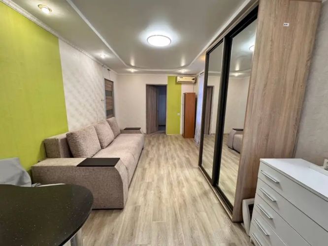 Расположена на высоком 1/9 этаже, есть балкон с погребом.