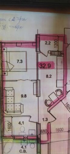 Квартира розташована на 4 поверсі. Загальна площа 32,9 кв.м (вітальня - 17,1 кв.м, кухня - 8,2 кв.м, ванна - 4,1 кв.м, передпокій 1,3 кв.м, лоджія - 2,2 кв.м).