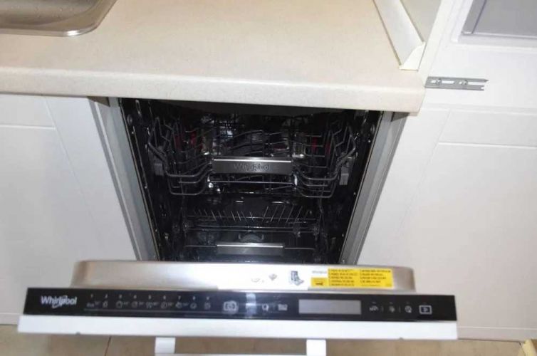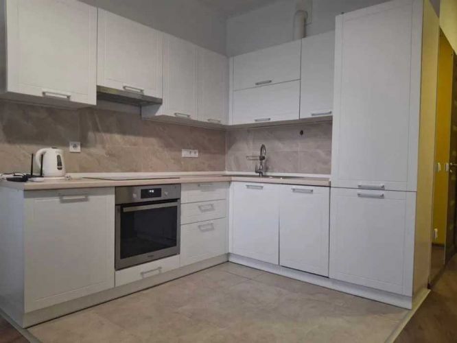 Вбудована кутова кухня з варильною поверхнею Schott Ceran, горизонтальною витяжкою Elica, посудомийною машиною, вбудованою духовою шафою та 2х камерним холодильником Whirlpool, телевізор LCD Toshiba 32’, кондиціонер Kentatsu, компактний розкладний диван, стіл кухонний, мякі стільці, в робочій зоні кухні на підлозі плитка для підлоги.