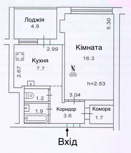 2/16 поверхового будинку. Висота стелі 2,53 м.