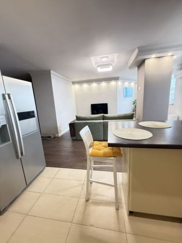 Кухня-вітальня з барною стійкою, вся техніка (посудомийна машина, духовка, варильна поверхня, витяжка, великий холодильник з льодогенератором, мікрохвильова піч).