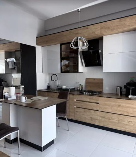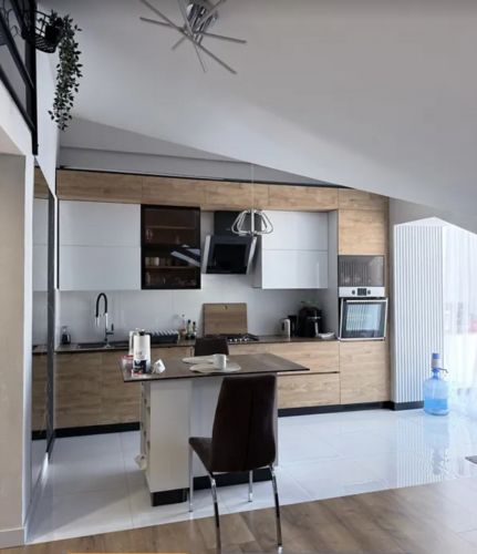 Квартира загальною площею 105 кв. м, дворівнева, верхній рівень мансардний.