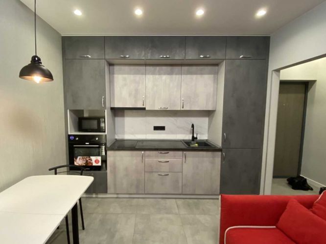 Простора кухня-вітальня з зоною відпочинку (розкладний диван, телевізор). Засклена лоджія з можливістю облаштування робочого кабінету або лаунж-зони. Окрема спальня з великим двоспальним ліжком та місткою шафою-купе.