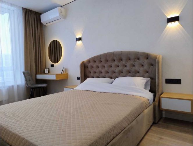 Простора квартира 48 м2, (кухня-вітальня, окрема спальня, коридор санвузол з ванною, Гардеробна). Виконано якісний, ремонт по перевіреному дизайн-проекту в сучасному класичному стилі! Індивідуальні меблі, якісна побутова техніка(пральна машинка, варильна поверхня, мікрохвильовка, духова шафа, холодильник смарт телевізор, кондиціонери), тепла підлога, топове зоноване освітлення